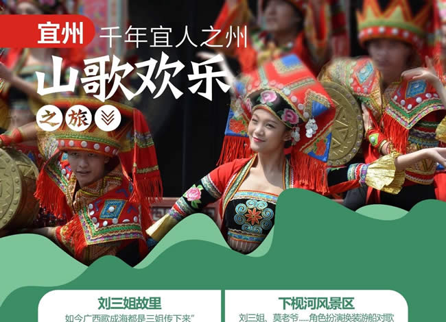 早餐后,乘車前往宜州國家AAAA級景區(qū)【劉三姐故里】景區(qū)包括龍江河、下枧河、流河寨、壯古佬、寨中保留有劉三姐故居、阿牛哥家、王媒婆家及劉三姐歌臺等,寨門有壯妹山歌迎賓,還有實景演出,是一個充滿民俗特色的旅游景區(qū)。下枧河是到達劉三姐故居的之地,兩岸青山綠水,河道中還有較多巖石,仿若“水上石林”。船 行其上時,還會時不時飄來山歌,非常有意思。到達流河寨,方可一探寨內(nèi)的劉三 姐故居。在下枧河與龍江河的交匯處有一塊“望妹石” ,相傳劉三姐掉下山崖后,阿牛哥總是站在這里癡癡地望著,希望能看到劉三姐平安歸來,后人便把他站的這塊石 頭叫做“望妹石”。乘船穿梭在河中,劉三姐與阿牛哥劃著小舟,唱著山歌的情景便不禁浮現(xiàn)。宜州是著名壯族歌仙劉三姐的故鄉(xiāng)。