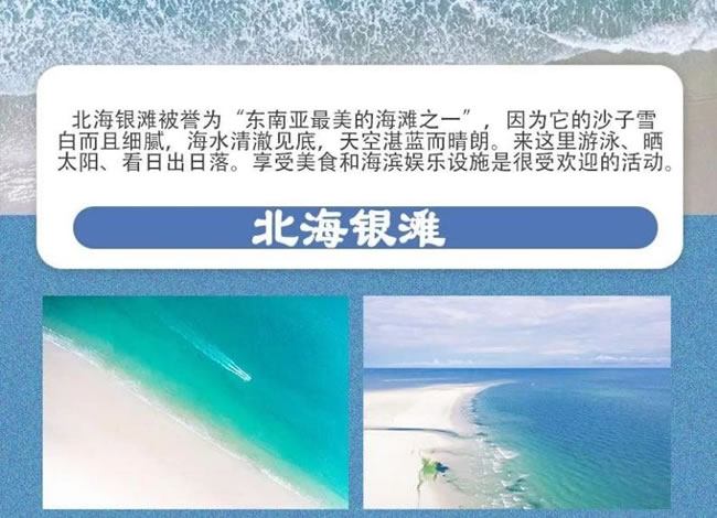 北海銀灘被譽(yù)為“東南亞最美的海灘之一 ”因?yàn)樗纳匙友┌锥壹?xì)膩,海水清 澈見底,天空湛藍(lán)而晴朗。來這里游泳、曬太陽、看日出日落。享受美食和海濱 娛樂設(shè)施是很受歡迎的活動