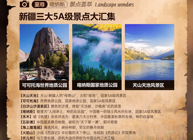 【白沙山沙漠】(贈送,游覽約1小時)白沙山意為銀色的沙漠,只有460米高,高度上在帕米爾高原上確實比較弱,但白沙山長度卻綿延1200米,每當(dāng)有勁風(fēng)吹來,白沙山都會發(fā)出響聲,故而又被稱作“響沙山”。與白沙山緊鄰的兩個湖泊,水草豐美,水鳥聚集,為這座白色的山峰平添了幾分清新活力。從遠處望去,在遠方的青山和近處綠草的映襯下,白沙山有的像埃及的金字塔,有的像棱角分明的歐式建筑,還有的像一條銀色巨龍靜臥在碧波蕩漾的大海上。銀色的細沙潔白柔和,像嬰兒的肌膚,令人心動,不忍下足。獨家贈送【全地形沖浪車激情體驗】(專業(yè)車手駕駛 贈送項目自愿放棄,不做任何退費)隨著車速的增加,沖浪車猶如一艘勇敢的船只,在沙丘之間往返穿梭,留下一道道深深淺淺的車轍,沙丘在車輪下迅速閃過,仿佛一朵朵巨大的浪花在沙漠中翻滾,翻越陡峭的沙丘,穿越沙漠中的障礙 ,給人帶來前所未有的刺激和樂趣,以及征服自然的成就感;【喀納斯景區(qū)】(含門票+區(qū)間車,游覽時間約2小時)國家AAAAA級旅游景區(qū),位于新疆維吾爾自治區(qū)阿勒泰地區(qū)布爾津縣北部,有駝頸灣、變色湖、臥龍灣、月亮灣、神仙灣等主要景點;電影[天地英雄]、劉若英-[分開旅行][原來你也在這里]的取景地;【圖瓦人探秘】(贈送,游覽約1小時)進入圖瓦人家木屋,圍坐在一起,品嘗香醇的奶酒、奶酪、民族點心,聆聽圖瓦人特有的民族樂器-蘇爾演奏,婉轉(zhuǎn)的曲調(diào),悠遠悠長,恍若隔世,伴隨原汁原味的音樂欣賞蒙古族圖瓦人的磅礴舞姿,豪放有力,不禁讓人潸然淚下。